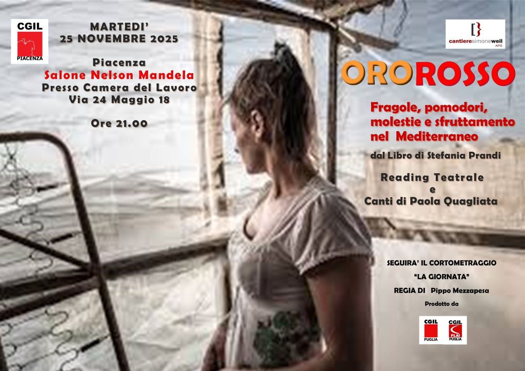 Il reading si terrà martedì 25 novembre 2025, alle ore 21, presso la Camera del lavoro – Salone Nelson Mandela – Via XXIV Maggio n. 18 – Piacenza